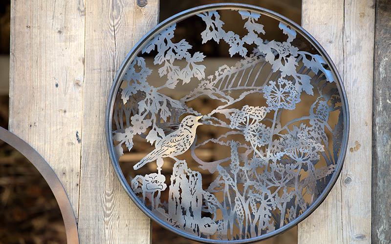At the centre of the garden is a birdhouse den, made from reclaimed materials and featuring six hand-crafted metalwork motifs of threatened UK songbirds. A circular pond provides shallow water for birds to drink and bathe in.