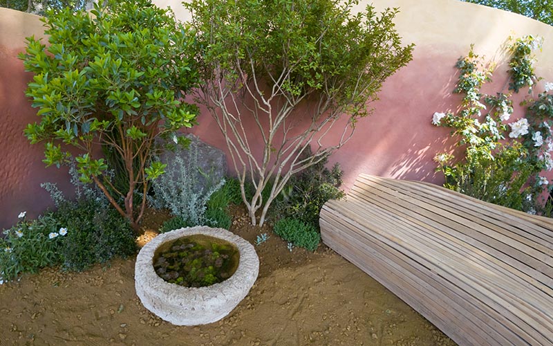 Planting is inspired by mountainous parts of the Mediterranean, with a naturalistic feel that brings in colour, fragrance, interesting bark and wildlife. Natural clay render softens the walls, while the selection of trees, shrubs, herbs, perennials and annuals further the calming visual appearance. Trees include Platanus orientalis (oriental plane), Cercis siliquastrum (Judas trees) and a range of Mediterranean shrubs such as Phillyrea angustifolia, Arbutus × andrachnoides and myrtle.