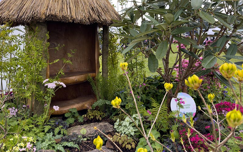 Best Beautiful Border and Platinum Award winner was ‘Not all those who wander are lost’ by Furzey Gardens and Minstead Trust who provide training and work experience for people with learning disabilities. The Border was inspired by a poem from J.R.R. Tolkien’s The Fellowship of the Ring, and features plants grown at Furzey Gardens, a stepping stone path, and a grand chair carved from the trunk of an old Elm tree.