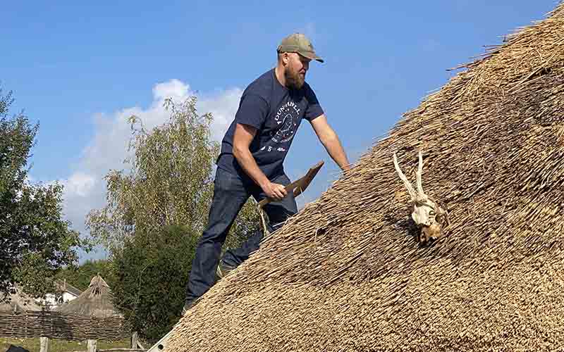 The reconstructed roundhouse is based on a Bronze Age building from around 1200 BC. 25 military veterans together with archaeologists from Butser Ancient Farm spent over 1000 hours working on the build which started in April. The project has allowed archaeologists to gain new insights into the way earth-walled roundhouses might have been built and it also allowed the military veterans to participate in a number of workshops, learning construction skills including thatching, woodworking and daubing as well as other essential ancient skills including pottery, spinning and cookery.